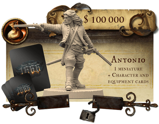 Note: the miniatures included in Anno Domini 1666 are plastic and come assembled and ready to play right out of the box. They are 28 mm scale. We have provided the option of ordering metal cast miniatures for gamers who prefer them. Please pick your pledges and rewards carefully! All metal miniatures require assembly. Below you can see an example of real model – on the left plastic model (production sample from a factory) on the right metal model undercoated gray.