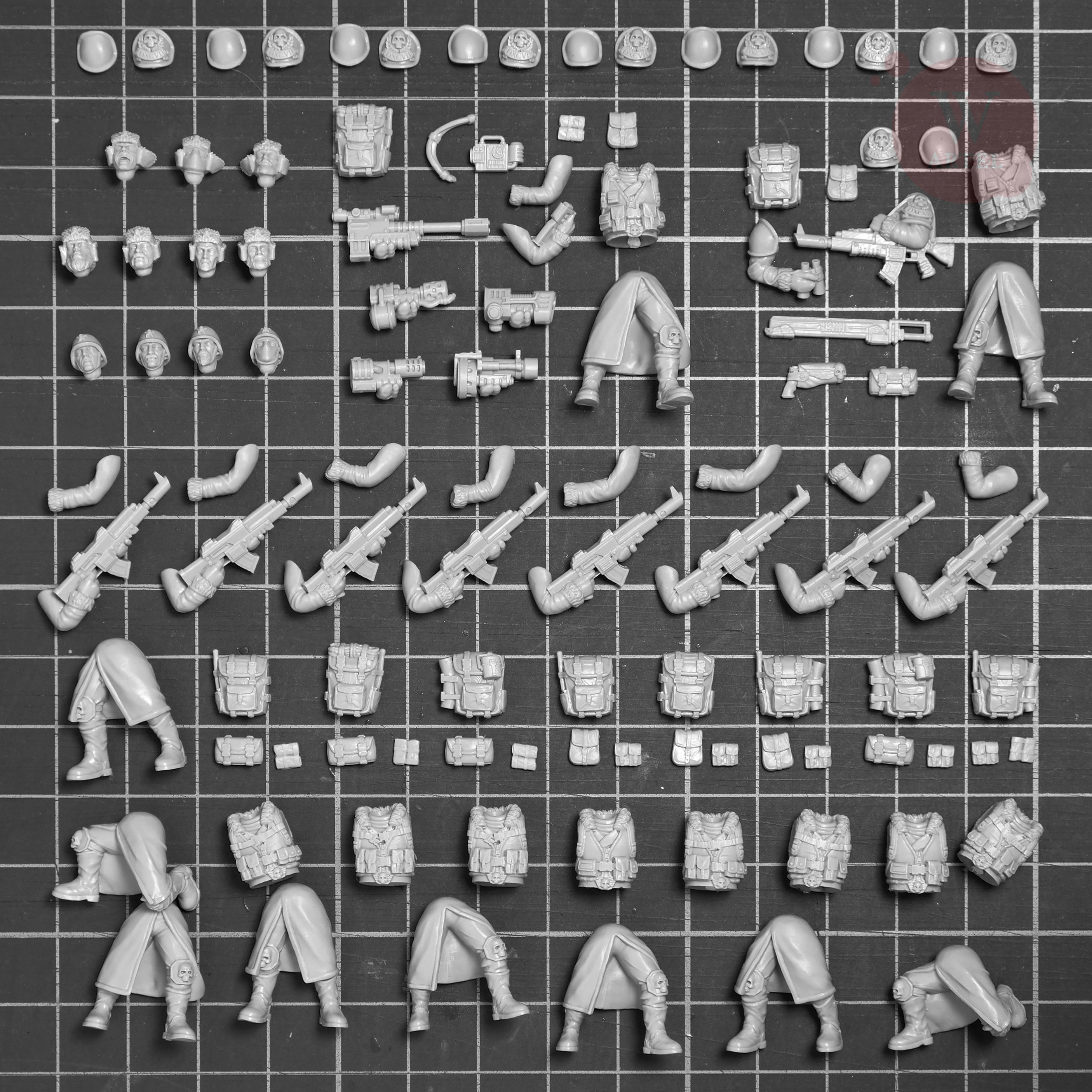 Kit contains parts for ten miniatures including one specialist and one sergeant, with 5 weapon`s options for the specialist. All arms, heads and torsos are fully interchangeable and compatible with kits for popular wargames systems.