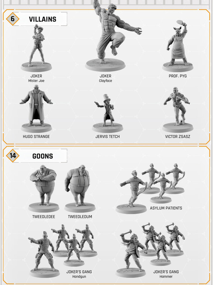 Facing the heroes is one player: the villain. They alone command their multiple troops represented on the game board by grey miniatures.