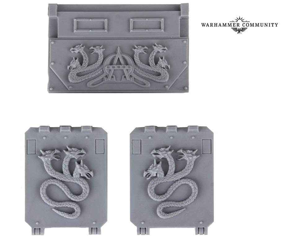 Two Legions also had new sets of vehicle doors revealed. The triple-headed serpent of the Alpha Legion appears on Rhino, Land Raider and Deimos-pattern doors, while the reptilian sigil of the Salamanders adorns all of those as well, plus doors designed for the Primaris Repulsor in Warhammer 40,000.