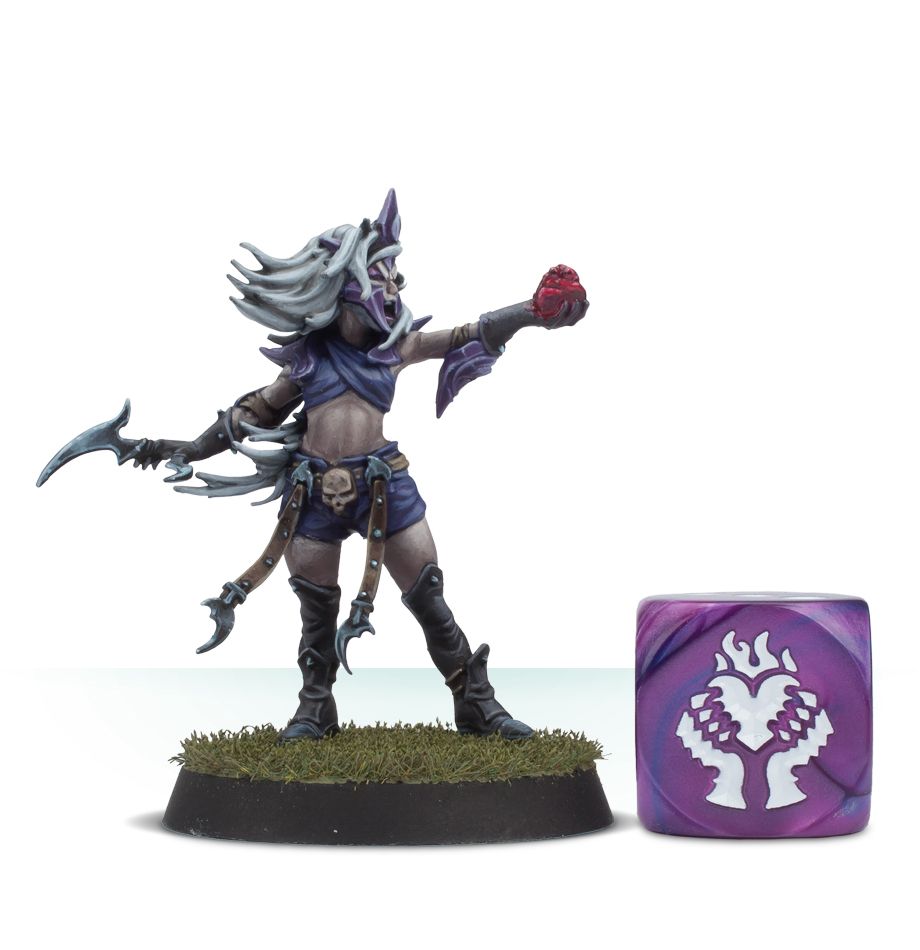 Dieses Set aus schillernd blau- und lilafarbenen Würfeln mit weißen Symbolen ist der perfekte Begleiter für ein Blood-Bowl-Team der Dunkelelfen und zeigt ihr Symbol anstelle der 6. Das Set enthält: