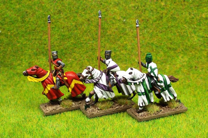 More previews of the 13th century feudal range — knights in barrel helms with lance up, on caparisoned horses, and knights in kettle helmets with lance at 45 degrees on unarmoured horses.