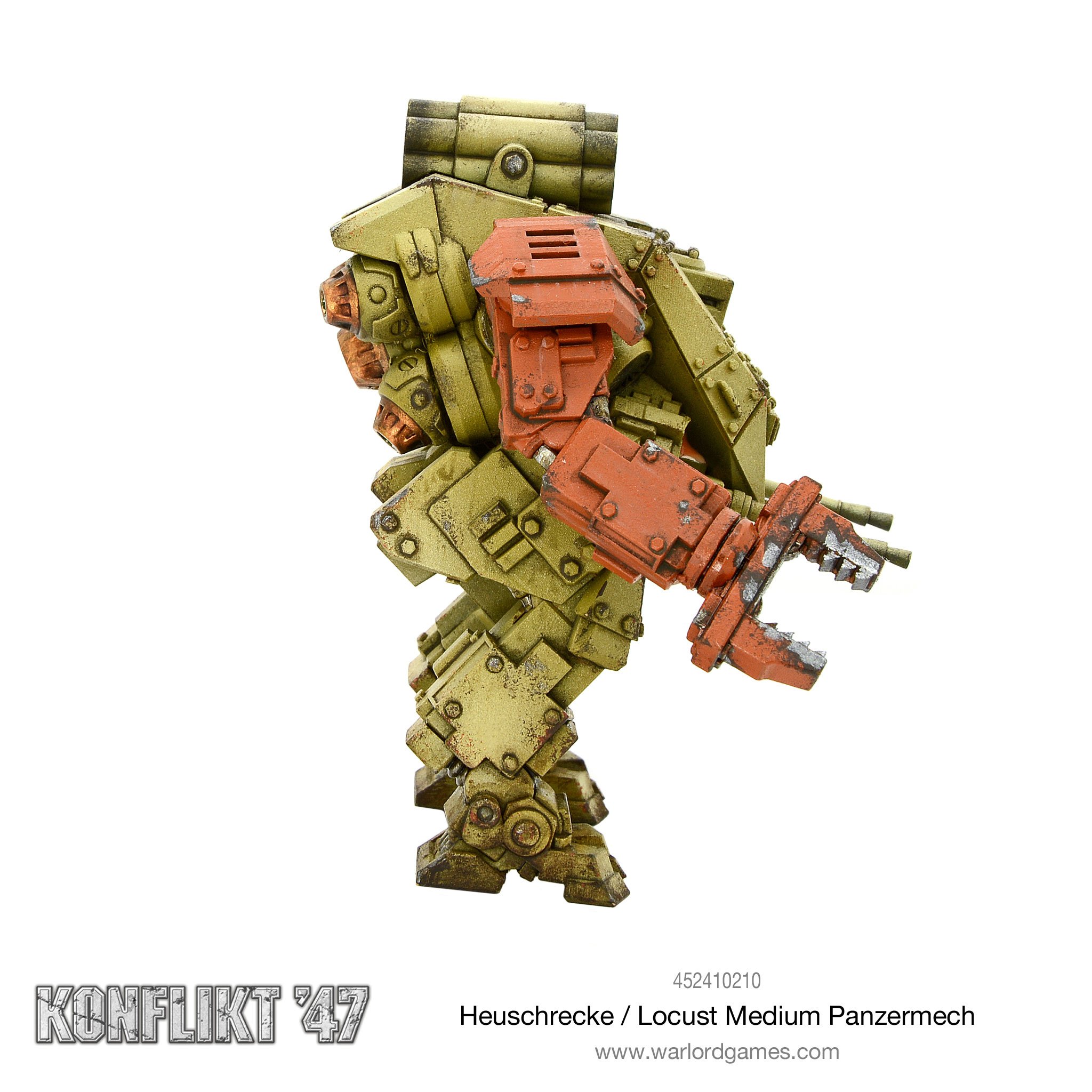 The Heuschrecke or Locust medium panzermech benefits from both heavy utility arms and a considerable weapon load, whilst its use of grav technology to jump over difficult ground or obstacles only adds to its versatility. This is an ideal weapons platform for supporting Falcon fallschirmjägers or other fast assault units.