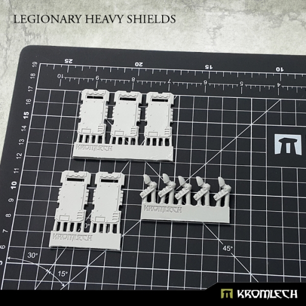 This set contains 5 highest quality resin Legionary Heavy Shields with holding arms.