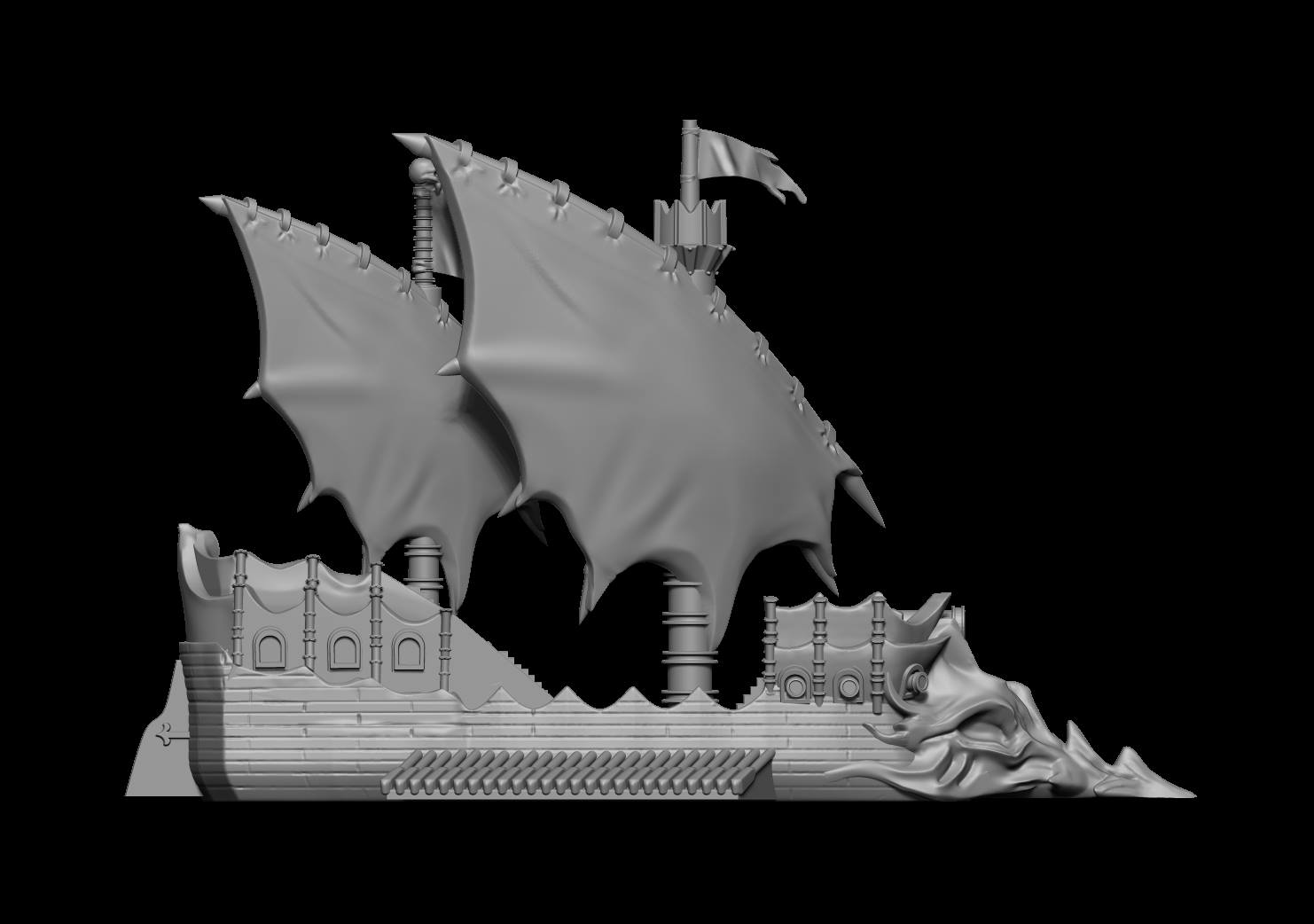 Seeking comments about the Dark Alliance Galleas. How do people feel about the mixed wood on the bottom and armor on top look? Should it just be all wood, buttresses extended top to bottom? Yard arms too curved?