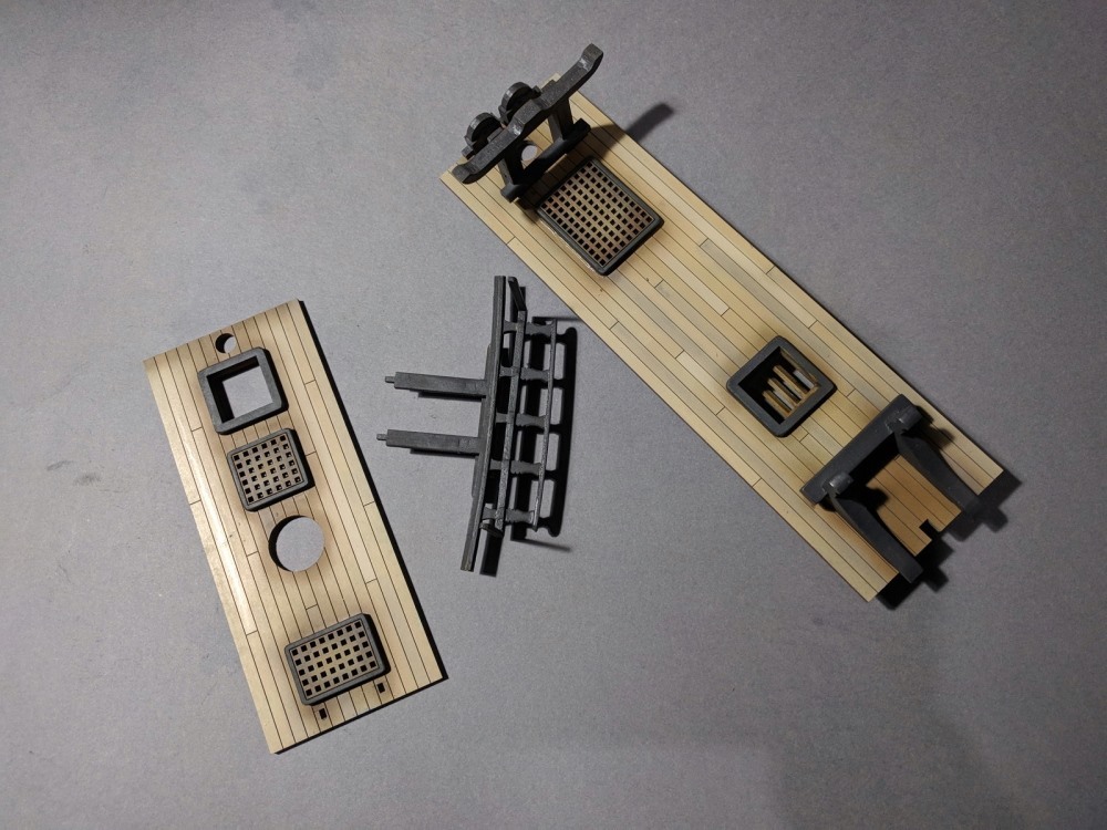 Having said that, I did mask the deck planks with some sticky-notes and sprayed them slightly different wood shades for a bit of interest/ variation. Also found a spray-can of charcoal grey matt which looks excellent instead of stark black for the fittings.