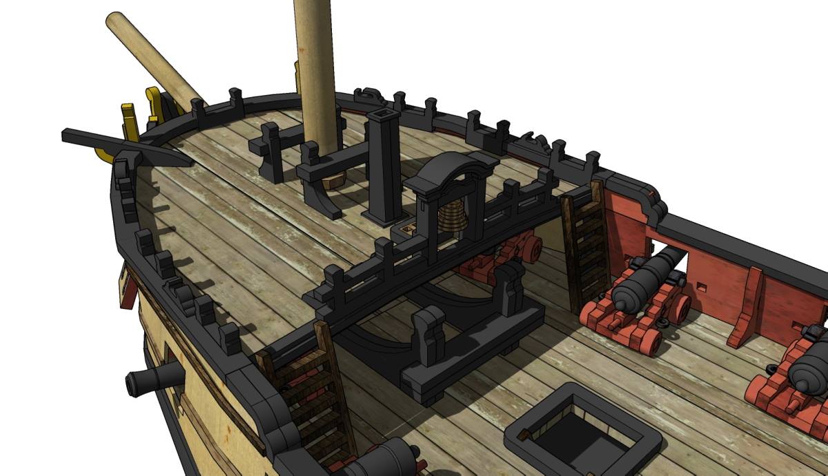 There’s a few things to add under the quarterdeck, like the temporary wall in front of the captains cabin and the lower capstan. There’s supposed to be an oven under the fore deck between the bitts too. I’ll do a basic representation of that as well.