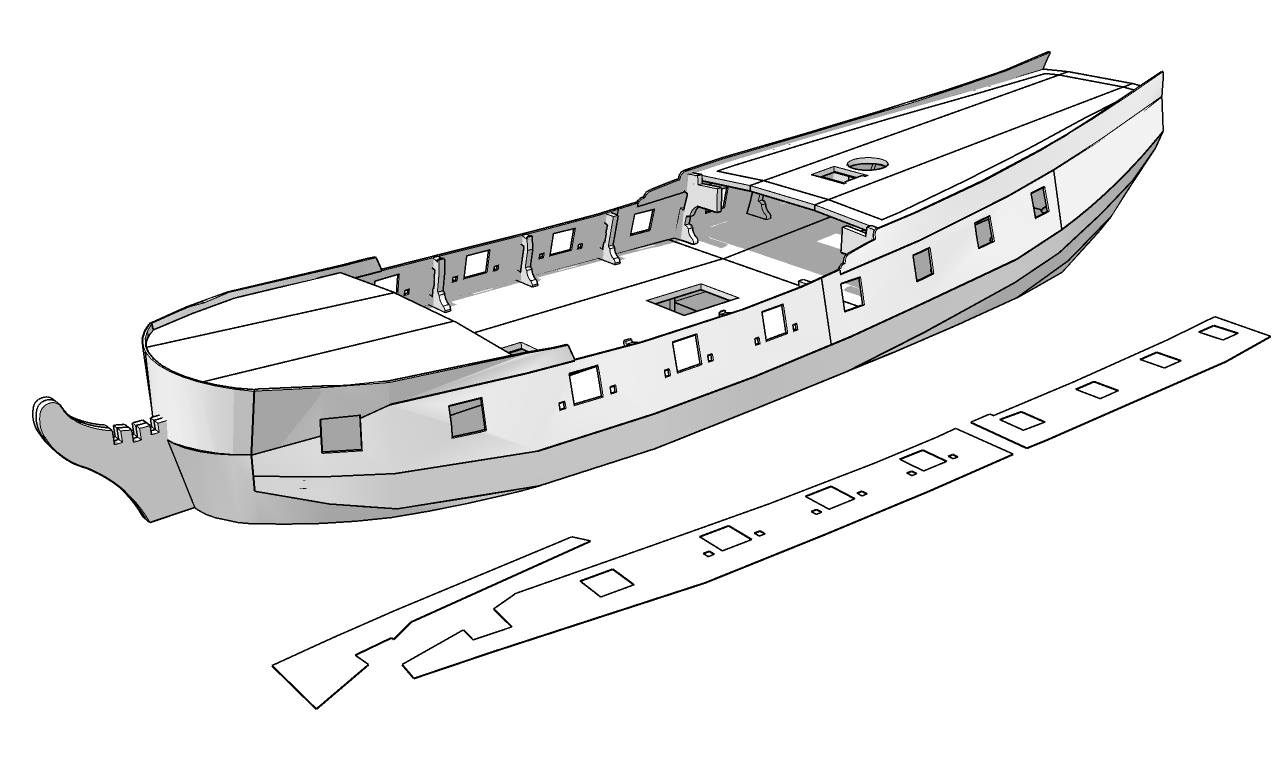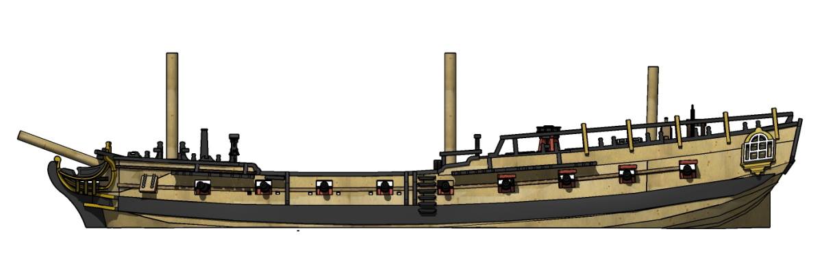 Gundeck. The deck on which most of the guns are placed. It’s a Nautical, technical term. Also added the fore-deck and quarterdeck. Sadly, There’s no poop-deck in this design, so childish giggling will have to be kept to a minimum.
