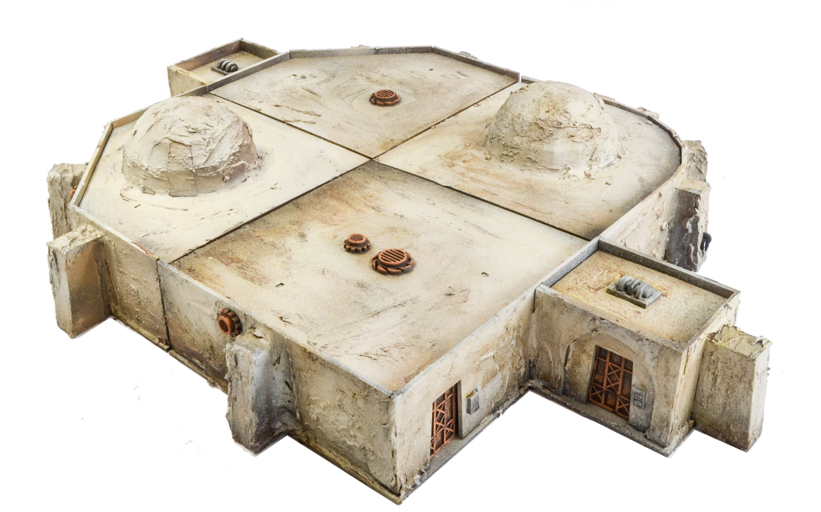 The kit contains four (4) modular building sections that can be put together to form a massive spaceport cantina with over 550x400mm footprint – or used separately at the table edges and corners as standalone buildings.