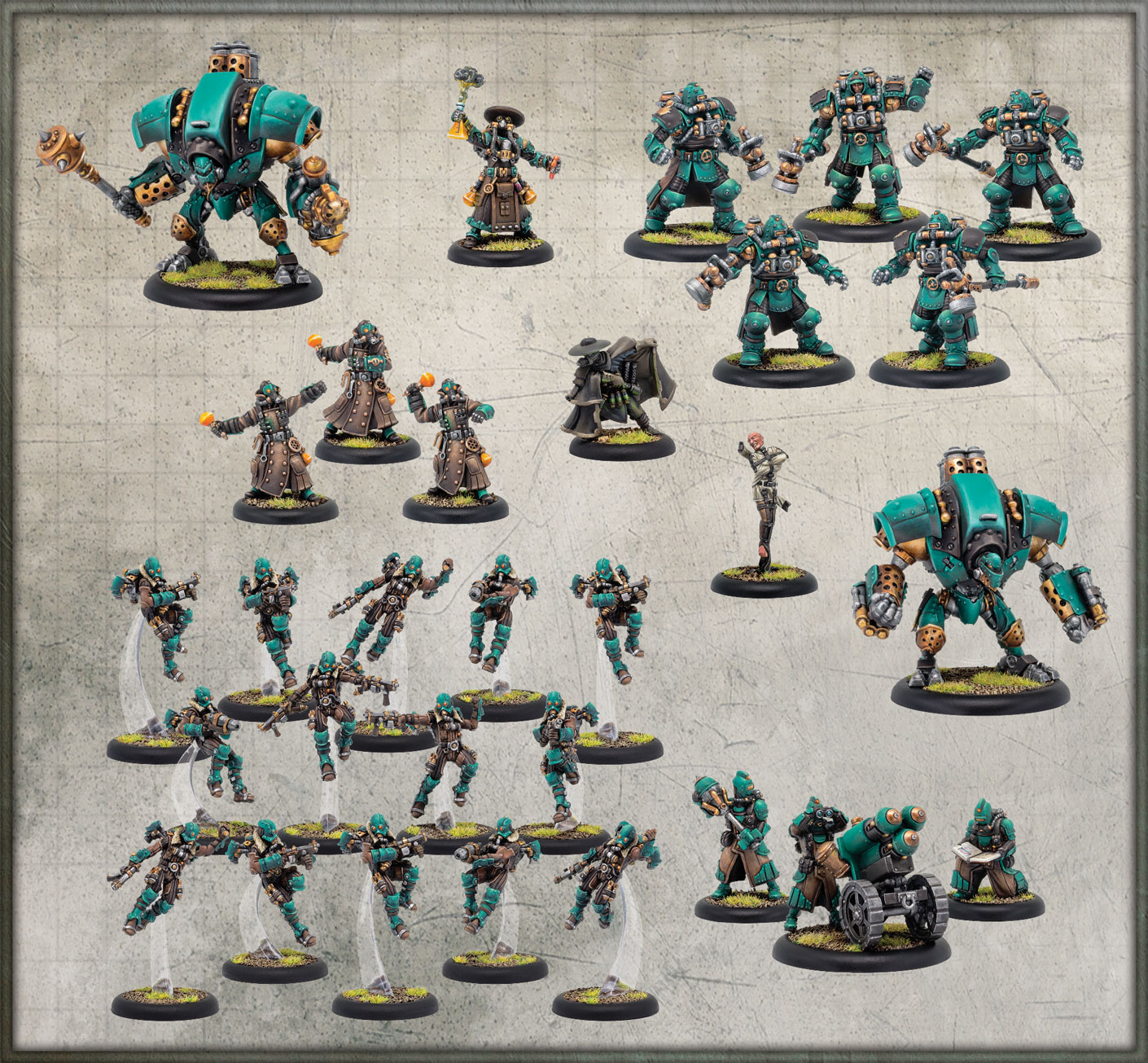 he sizzle of acid eating through armor, the roar of pyrophoric ammunition burning a target alive, and the hiss of gas venting from grenades, jet packs, and rocket shells—these are the sounds that accompany the Crucible Guard in battle. This army of alchemist-soldiers represents the most scientifically advanced military to hit the battlefields in the modern age. After their former headquarters was seized by hostile forces, the Guard reformed under the direction of a new patron and a cadre of radical leaders who advocate a more aggressive agenda. Emerging from smoke-filled laboratories and workshops, their faces veiled by gas masks and their bodies protected by advanced gear, they stand ready to use whatever force is required to reclaim what they lost and to secure their rightful place among the great powers of the Iron Kingdoms.37002 Aurum Adeptus Syvestro (metal/resin)
