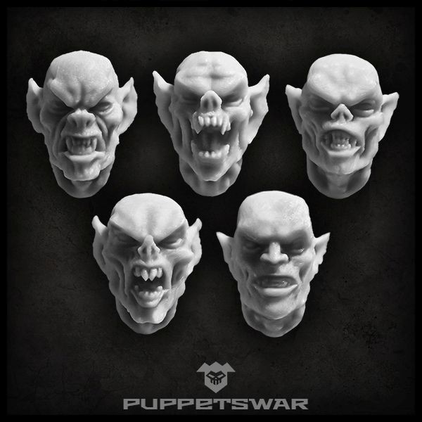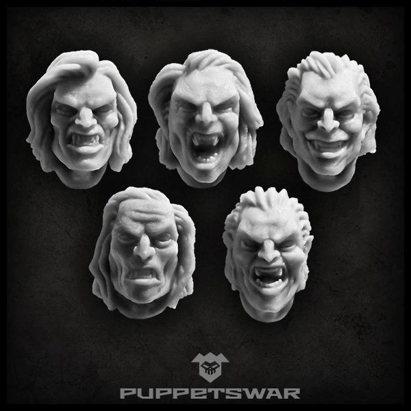 Set contains 10 resin frenzy vampire heads, designed to fit 28mm tabletop wargames scale, supplied unassembled and unpainted.