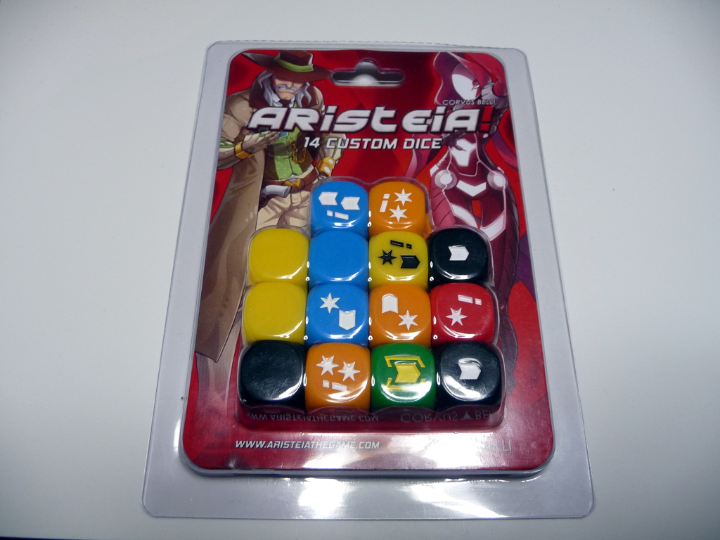 Nun, dazu gibt es recht wenig zu sagen. Es handelt sich schlicht um einen kompletten weiteren Satz Würfel wie er auch bereits im Grundspiel enthalten ist. Wozu also das ganze noch einmal als Set heraus bringen? Nun, Grundsätzlich kann man sagen dass bei Aristeia! die Anzahl der geworfenen Würfel nach oben begrenzt ist. Es dürfen zu jeder Zeit maximal je 3 schwarze, orange, gelbe oder blaue Würfel eingesetzt werden. Rot und Grün sogar nur jeweils ein einziges Exemplar. Und schon haben wir eine Gesamtauflistung der enthaltenen Würfel. Es ist sogar so dass einige eher im Angriff und andere eher in der Verteidigung verwendet werden. Dennoch: zumindest die schwarzen Würfel könnten per se knapp werden. Und dann gibt es noch Charaktere wie z.B. Wild Bill der mal eben als Verteidigung auf ein nettes Set offensiver Würfel wechseln kann, darunter auch der rote Würfel. Solange also bei zwei Spielern nur ein einzelnes Grundspiel genutzt wird ergibt dieser Würfelpack durchaus Sinn, da die Würfelergebnisse und „Switche“ erst eingesetzt werden wenn beide Spieler gewürfelt haben.