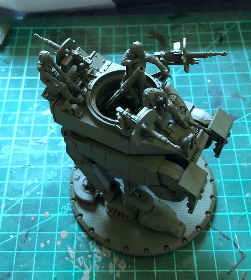 Da es sich beim Meatgrinder/Pulverizer um ein Primed Modell handelt, beschränkte sich der Zusammenbau darauf die Teile aus der Luftpolsterfolie zu entnehmen und Gussgrate am Walker und den Waffen zu entfernen. Diese können mit einem Bastelmesser relativ unkompliziert entfernt werden, hierbei wird jedoch die Grundierung an der entgrateten Stelle entfernt.
