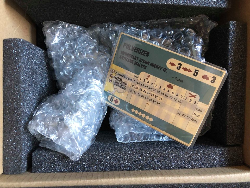 Der Walker kam, genau wie der schon betrachtete Truck von Dust, verpackt in Luftpolsterfolie in einer unscheinbaren brauen Versandbox mit einem Sticker als Cover, sowie einem Sticker mit generellen Warnhinweisen und Herstellerangaben auf der Rückseite der Box. Zusätzlich waren alle Seiten der Schachtel mit Schaumstoff gepolstert.