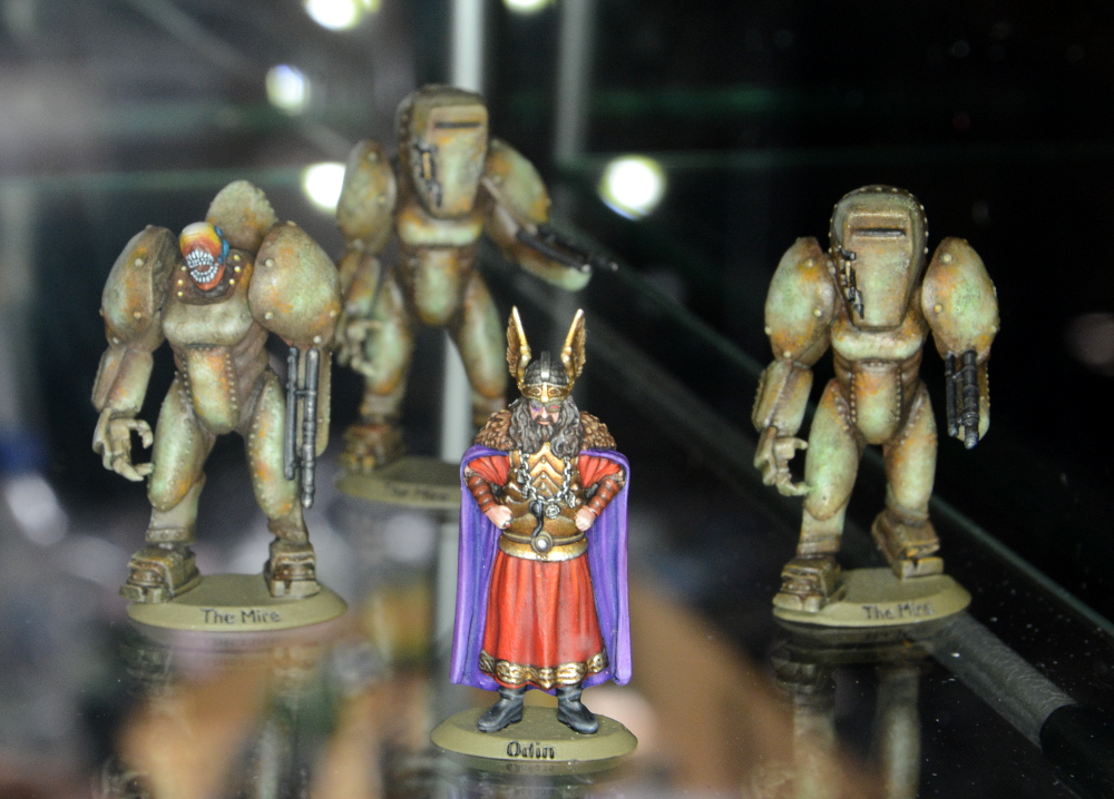 Das Licht und die drehenden Etagen machten Fotos in der Vitrine leider etwas problematisch, die neuen Falkner für Guild Ball ließen sich deshalb nur unzureichend fotographieren: