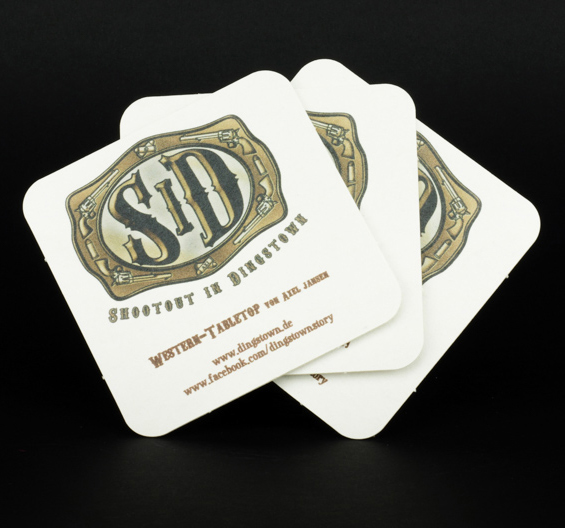 Die Bierdeckel sind einseitig in hoher Druckqualität mit dem Coverbild des Regelwerks zu „Shootout in Dingstown“ oder mit dem coolen Logo des Regelwerks zu „Shootout in Dingstown“ bedruckt, quadratisch mit abgerundeten Ecken und haben eine Seitenlänge von 9,3 cm. Sie sind aus 1,4mm starker Bierdeckelpappe hergestellt, ökologisch nachhaltig, biologisch abbaubar und kompostierbar.