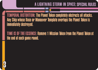 This Mission has two special rules: Temporal Distortion and Time is of the Essence. Temporal Distortion makes the Planet Token completely obstruct all attacks and causes any ship whose base or maneuver template overlaps the Planet Token to get immediately destroyed. Time is of the Essence simply removes a Mission Token from the Planet Token at the end of each game round.