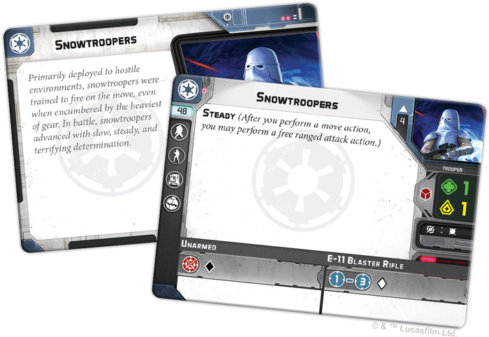 Employing specialized gear and trained in ruthless assault tactics, snowtroopers move slowly but deliberately, their expressionless helmets and relentless blaster fire intimidating any enemy in their path. These troops give Imperial commanders another option when selecting the corps units that will comprise the rank and file of their armies. Still, both Snowtroopers and traditional Stormtroopers have different abilities to offer.