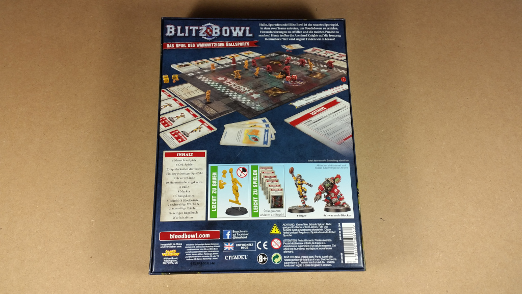 In der Box sind drei Kartenpacks enthalten. Insgesamt befinden sich in den zwei Packs die Spielerkarten der beiden Teams, sowie die Herausforderungskarten und Bonuskarten, die das Spiel noch etwas knackiger machen. Zusätzlich sind auch Spielerkarten für andere Teams dabei, nämlich für die Elfen, Goblins, Zwerge, Skaven und für das Chaos.