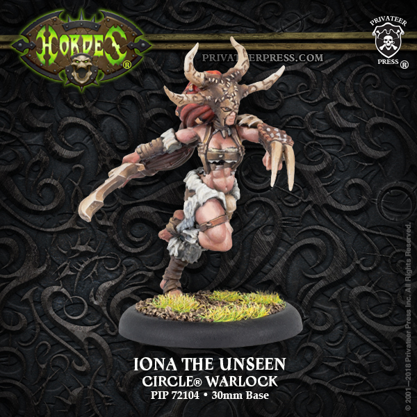 Though the Tharn possess their share of shamans, true warlocks are rare and revered, each a formidable leader, capable of unsurpassed feats on the battlefield. Iona the Unseen is among the rare few, a huntress whose fierce gaze can force obedience from both warbeast and subordinate Tharn alike. A fearless hunter, Iona draws on the predatory aspect of the Devourer Wurm, granting her forces speed and stealth as they surround her enemies like a pack of dusk wolves. She employs clever feints and decoys and relishes the sight of her enemies’ confusion as her pack slowly encircles them.