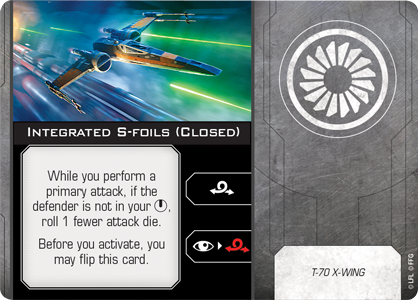 This free Configuration upgrade adds the barrel roll action to the T-70’s action bar, as well as the ability to link a focus action into a barrel roll. Since he’s able to use both the boost and barrel roll actions in the same activation, Poe should have little trouble perfectly lining up his shot in his bullseye arc and rolling all three of his attack dice, even with his S-foils closed.