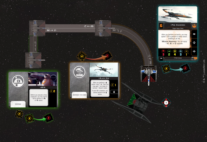 With BB-8, Poe Dameron can perform a barrel roll before executing his three-straight maneuver. He can then use his Black One title to perfom a SLAM action and pull within Range 1 of the TIE Silencer. Finally, he can use his ability to acquire a lock on the Silencer!
