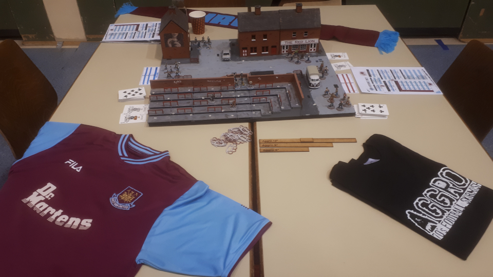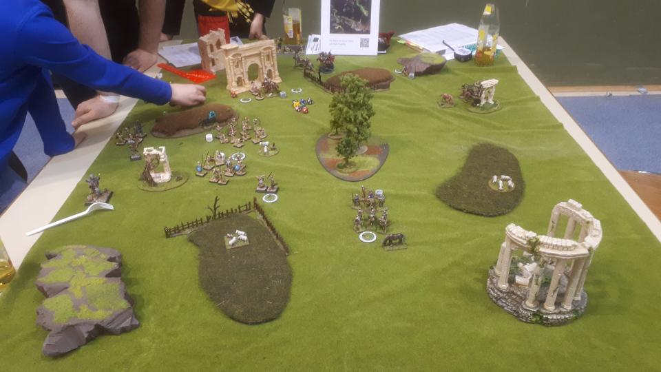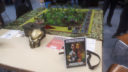 Natürlich stellte auch die Ad Arma gleich mehrere der Demotische. Aber auch für das leibliche Wohl wurde gesorgt und dazu musste man nicht einmal über die Straße ins Restaurant gehen, denn es wurden belegte Brötchen, selbstgebackene Kuchen, Flammkuchen und Getränke zu moderaten Preisen angeboten. Der Eintrittspreis war mit 6 Euro angenehm angesetzt. Wer wollte konnte zusätzlich Clubminiaturen, Würfel oder Maßbänder erwerben. Außerdem durfte jeder Besucher für den schönsten Demotisch abstimmen. Dieser Titel ging nach dem Auszählen der Stimmzettel an das Asterix-Dorf. Zusätzlich gab es einen gut organisierten Bring&Sell-Bereich bei dem man seine Artikel lediglich mit einer Preisvorstellung abgeben musste und sich dann den Spieltischen und Austellern widmen konnte.