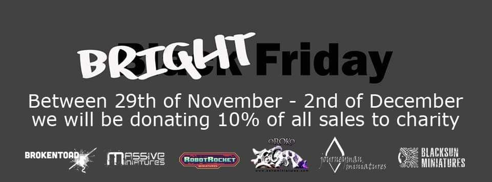 Von sechs Firmen gibt es eine Gegenaktion zu Black Friday. Vom 29. November bis zum 2. Dezember spenden BrokenToad, Massive Miniatures, Robot Rocket Miniatures, Kaha Miniatures Journeyman Miniatures und Black Sun Miniatures 10% aller Verkäufe an das Zoë’s Place Baby Hospice anstatt Rabatte zu geben.