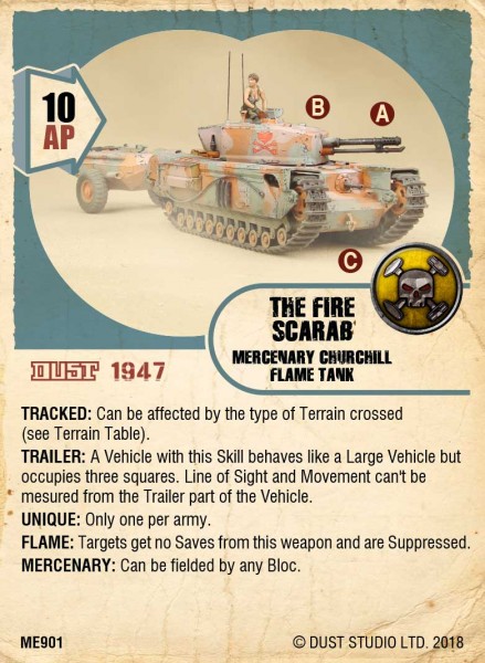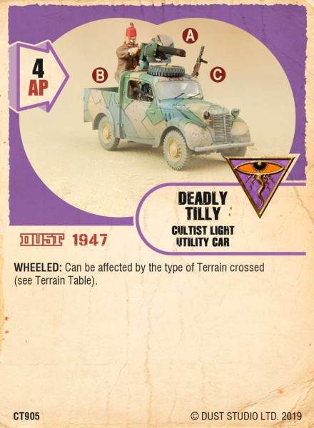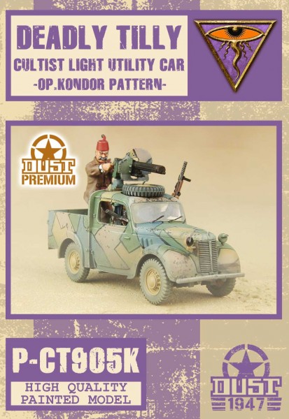 The Deadly Tilly is one of the Cult’s light assault vehicle, a re-purposed civilian vehicle, finding the enemies of the Mythos wherever they might hide! A simple and straightforward Vehicle, it’s here to gun down your opponents to death. It is presented here in Kondor camouflage pattern, as used in the Middle-East circa 1947.This item comes with its own Dust 1947 Unit Card, for the Mythos Bloc. Premium Edition models are not just “pre-painted”. What we offer is the exact replica of Dust Studio’s Master Painter’s work. Please remember that all orders over 250$ enjoy free shipping.