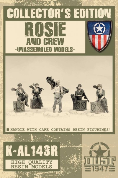 Recently promoted to Sergeant Major, Rosie continues to serve in the ASOCOM Counter Attack Division and is still the top Allied field mechanic. She continues to refuse to be sent to teach at at a military academy, but has accepted to be put in charge of her own team, who is presented here. She teaches all she knows to these girls, who might one day replace her or put together their own crew. Rosie just turned 30 this year and the Endless War is taking its toll on her, but her dedication and courage are still unmatched. Please note that these miniatures are cast in high quality resin.This reference comes with two Dust 1947 unit cards, for the Allied Bloc. This item is made of resin and needs assembly that requires cement. Models are supplied unpainted. We recommend these items for modelers over 14. Please remember that all orders over 250$ enjoy free shipping.