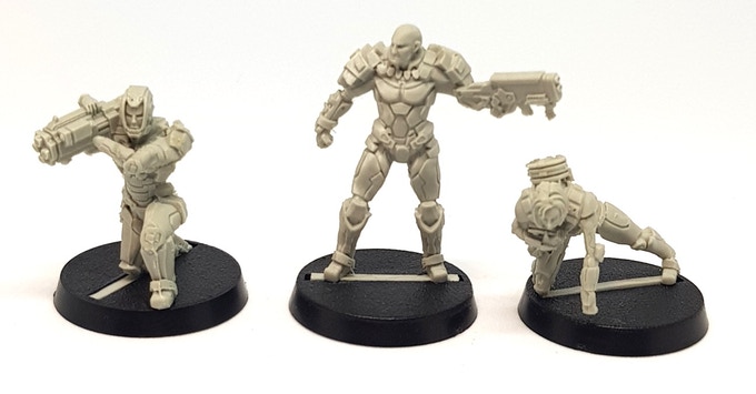 The ten highly-detailed miniatures (eight Stiletto Unit and two Smertios Security Guard types) have been modelled on a 32mm scale by the amazing Heriberto Martinez and are all available via this Kickstarter. They are being cast in high-quality resin in the UK by an experienced supplier.