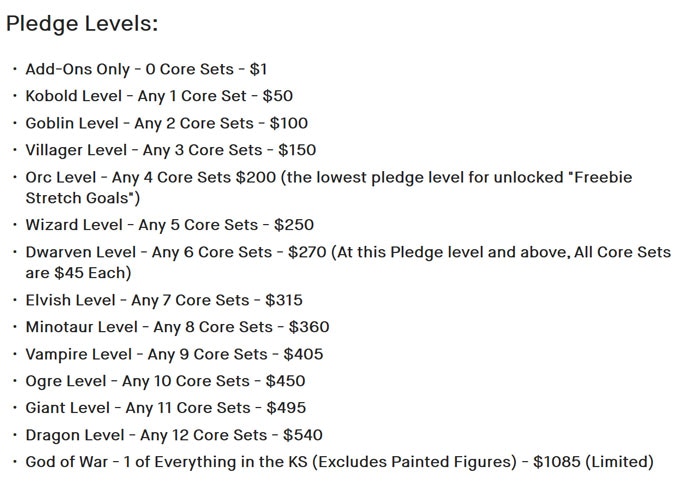 * Pledge Levels below „Orc Level“ do not receive the unlocked Freebies. We’d like to, but the economics simply don’t make it viable. Only Core Set Rewards determine Pledge Levels, add-on sets are not counted towards reaching Orc Pledge Levels.