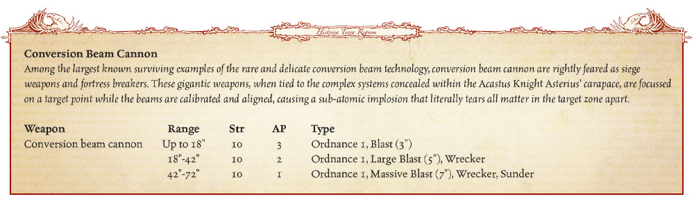 Of the gigantic Acastus-pattern Knights, the Asterius is among the most rare. Like its more common cousin, the Porphyrion, it boasts an armoured hide near impervious to weapons fire, striding across the battlefield like an angry giant beset by insects. It wields a pair of twin-linked conversion beam cannons – irreplaceable relics of a lost technology, each capable of sundering the walls of mighty fortresses and laying low powerful foes in a single blast.