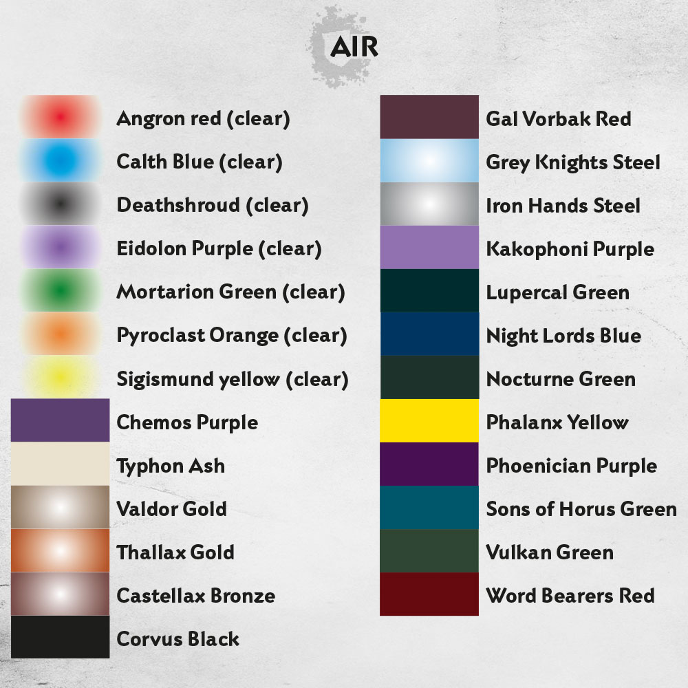 The new paint range is about making awesome results accessible for everyone, however they paint. We haven’t forgotten about you airbrushers out there, and to help you in your work, we’re relaunching the entire Air range! These paints are still the same great airbrush-ready formulation, but now in a larger pot for your convenience and with a wider range of colours, including a number of paints previously available through Forge World’s Air range.