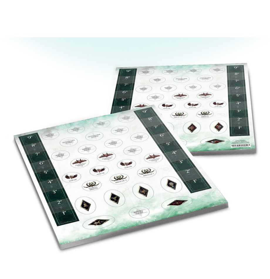 Diese Karten lassen dich deine Handlungen und Zauber auf dem Schlachtfeld einfach nachverfolgen. Sie sind mit schaurigen Artworks und Symbolen verziert und entalten alle Informationen, die du für den Einsatz einer jeden Einheit aus dem Battletome: Flesh-eater Courts in deinem Spielen brauchst, darunter auch ihre Endloszauber. Ebenfalls enthalten sind zwei Bögen doppelseitig bedruckter ausstanzbarer Karton-Spielmarker, welche dir den Überblick über alles von Befehlspunkten bis hin zu Fähigkeiten-Effekten sichern.