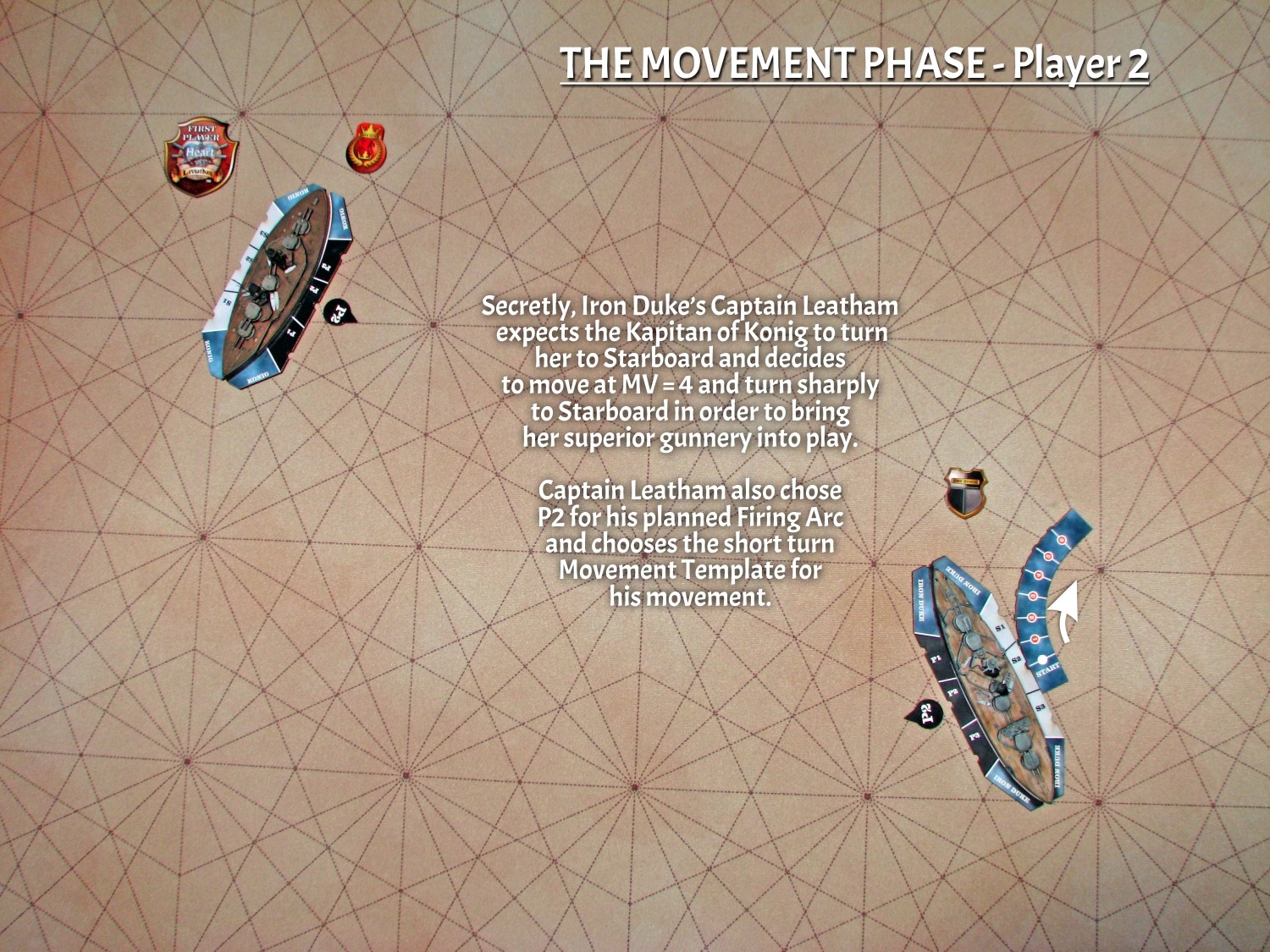 How to Play… Setup. Before game play begins, one red dice is rolled to determine initiative. The player rolling a hit has the option of becoming Player One and moving first or Player two. Here, the British player has become P1 and received the First Player Token which is swapped back and forth across the table on each turn alternating initiative between players. The Critical Damage Cards have been shuffled and placed alongside the Engagement Area.