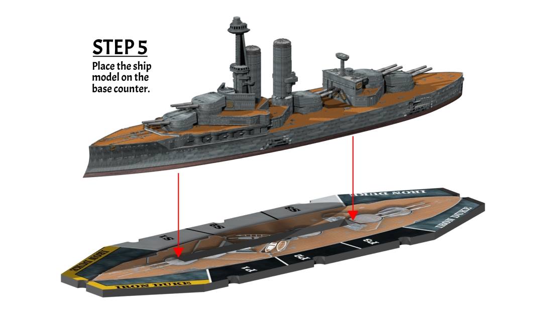 Here is a look at the ship counters that hasn’t really been shown. If you are not into building and painting ship models, the graphics on the counters are highly detailed renderings of the actual 3d printed models used to create the resin/pewter ship kits.. And, since the hull and most of the superstructure is a one-piece resin casting (with a positioning tab on the bottom) it can be used alone (without assembly) in game play to give some added depth. The counters, whether serving alone as game pieces or in combination with the ship models, is double sided (notice Konig). So, if your opponent brings the same ships to the fight, you can distinguish between them. The counters have a removable center slot to accommodate the tab of the ship model.