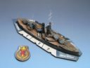 Here is a pic of the ship model parts included in the Core Game. Separate turrets and superstructure parts are cast in lead-free pewter. The hull is a single casting in high detail resin. Both the hull and turrets have depressions to allow you to add .10″ x 1/32″ magnets (not included) so the turrets can be rotated. Construction is designed to be quick and easy (glue and spray) – or – highly detailed – your choice. We even include a set of super detail stainless steel photo-etched parts to make each ship model „pop“. Detailed instructions and ship history are also included in a Ship Log for each vessel.