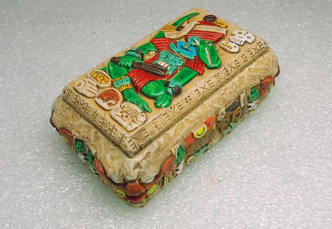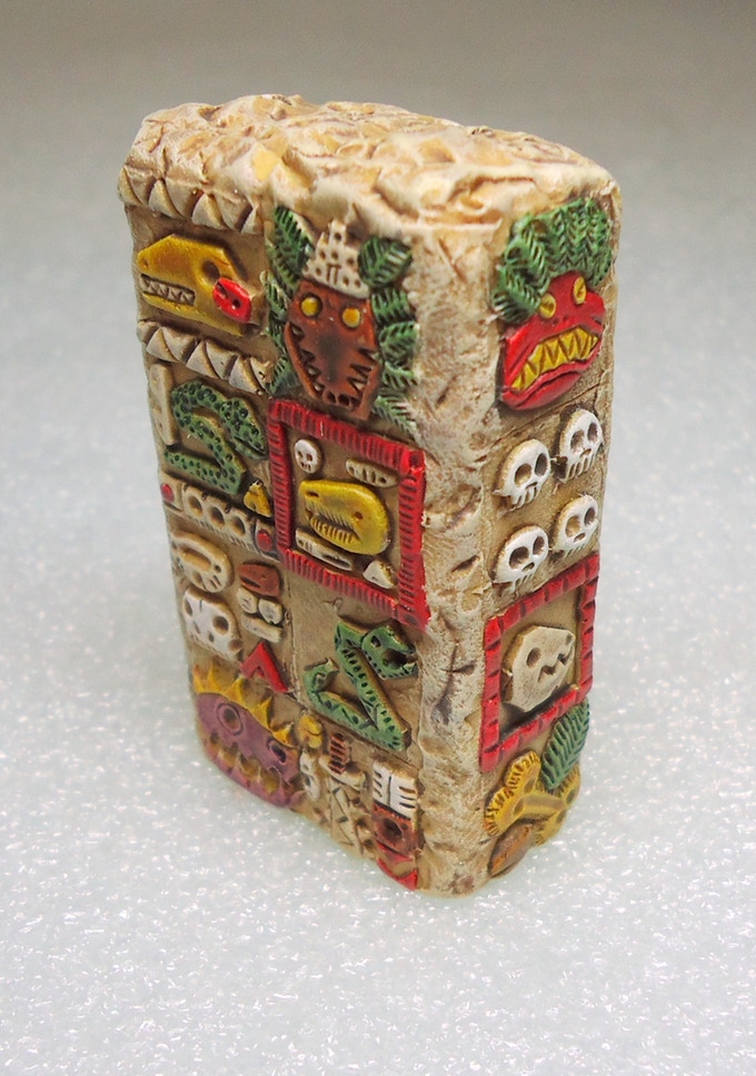 With a Lizard King sculpture and decorated with an additional 16 glyphs, this piece is 37x22x63mm (1.45×0.86×2.48″). Reward cost £8.