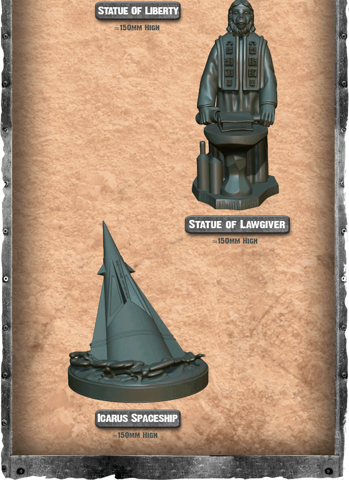 Planet of the Apesincludes a huge selection of beautiful 35mm scale plastic miniatures, ranging from Apes heroes, Human soldiers ( PotA Modern version) and Human Savages (PotA Origins 1968), to the Statue of Zaius, Icarus Spaceship and Statue of Liberty which are 150mm/ 6inch high. Although nominally 35mm (the height of an average ape), the miniatures are all different sizes depending on the individual they represent. This gives us a range from 30mm tall for the Bad ape miniature to the 150mm tall Lady Liberty. Each miniature is a carefully-sculpted masterpiece, full of character. Here’s a picture of other minis for scale comparison.