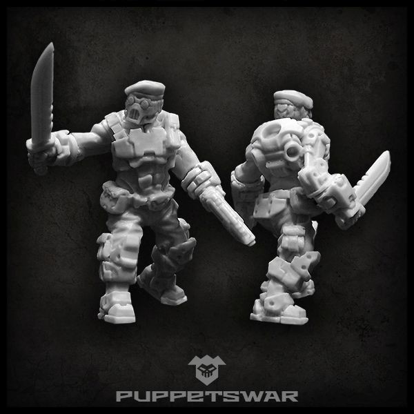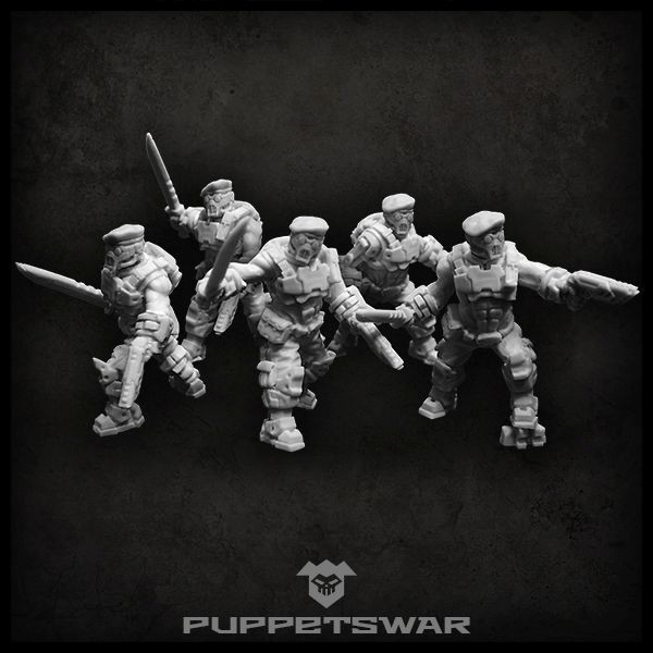 Set contains 5 commando trooper veterans. Models are designed to fit 28mm „heroic“ tabletop wargames scale, (max 33mm height). Arms have slots for 2x1mm magnets. Supplied unassembled and unpainted. Designed and sculpted by Puppetswar Team.