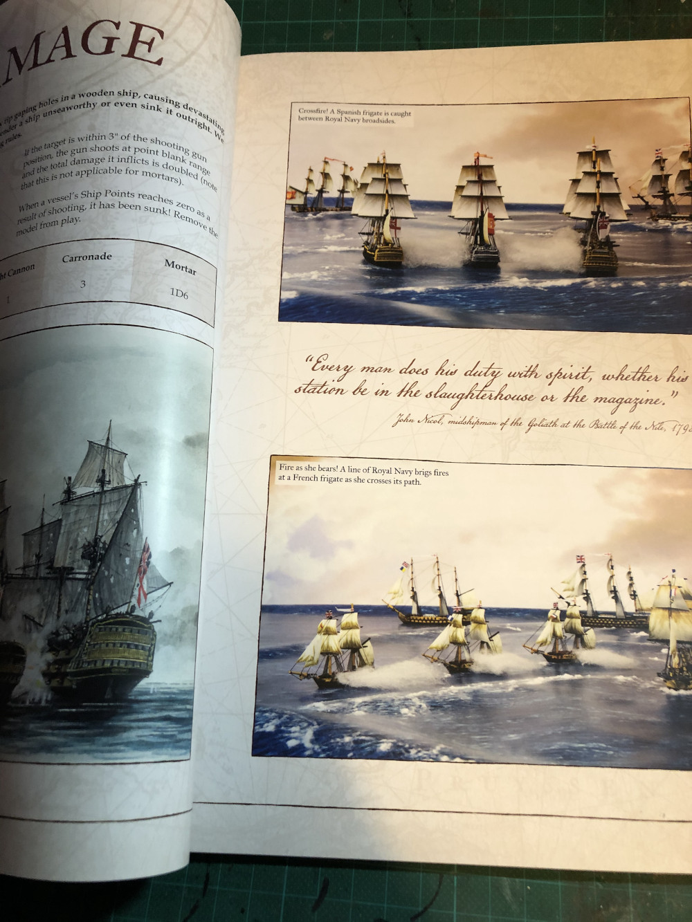 Wie man auf den Fotos sieht, ist das Buch visuell sehr schick aufgemacht. Die Regeln sind klar strukturiert und oft von Diagrammen begleitet. Gleichzeitig finden sich Artworks von Schiffen, Persönlichkeiten und Szenen die sich auf den Schiffen abspielten und Bilder von Ausrüstung die bei Seeschlachten eingesetzt wurden. Das Ganze wird abgerundet durch Fotos der Schiffsmodelle. Alles in allem kann sich das Buch also sehen lassen. Machen wir nun weiter mit:
