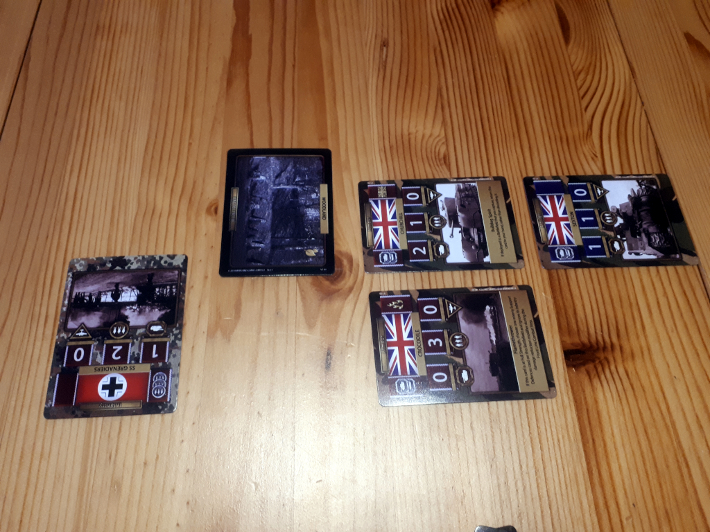 Sind diese beiden Phasen abgeschlossen kommt es zum Kampf und dieser ist logisch gestaffelt: Zuerst feuern Frontline- und Support-Einheiten auf Flugzeuge. Danach kommen die Flugzeuge zum Einsatz. Als nächstes feuert die Artillerie entweder auf die gegnerische Frontlinie oder den Support. Und zuletzt kämpfen die Frontlinien gegeneinander. Dabei hat eine Karte eine Unit Strengh, effektiv Lebenspunkte, eines bestimmten Typs (Infanterie, Fahrzeug oder Flugzeug) sowie Angriffswerte gegen Infanterie, Fahrzeuge und Flugzeuge. Neben einer eventuellen Sonderregel kann eine Einheit einen von 3 Zuständen annehmen. Kommt sie ins Spiel ist sie bereit (ready), nimmt sie das erste mal Schaden wird sie gedreht (depleted) und ist zwar noch anwesend, kann aber nicht mehr aktiv ins Geschehen eingreifen. Nimmt eine gedrehte Karte erneut Schaden wird sie zerstört und wandert auf den Ablagestapel. In einer einzigen Phase kann sich der Zustand einer Einheit maximal um eine Stufe ändern. Dabei werden bereite Einheiten zuerst beschädigt und nach Möglichkeit auch die mit der höchsten Unit Strengh bevorzugt. Der Schaden in einer Phase wird in einem Pool gesammelt und der Gegner muss den Schaden unter Einhaltung der genannten Einschränkungen auf seinen Einheiten verteilen.
