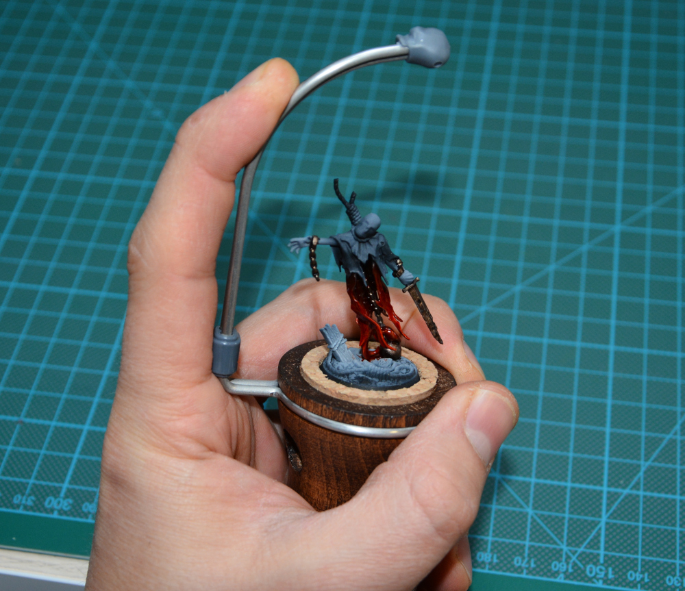 Der hat aber durch den großen Einspannmechanismus den Nachteil, dass man kaum bis gar nicht von unten an die Miniatur zum Bemalen kommt.
