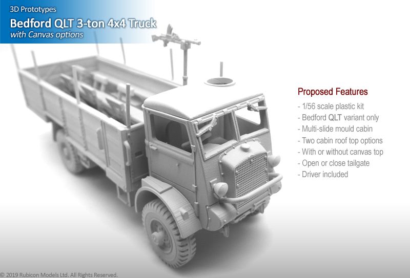 3D printed prototype of the Bedford QLT troop transport without showing the canvas top.