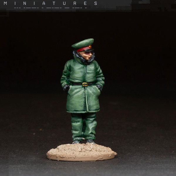 This figure is styled on uniforms worn by high level personnel in various ex-Bloc, former and current Communist states. He is dressed bracing himself against a harsh environment and wearing a stereotypical large hat.