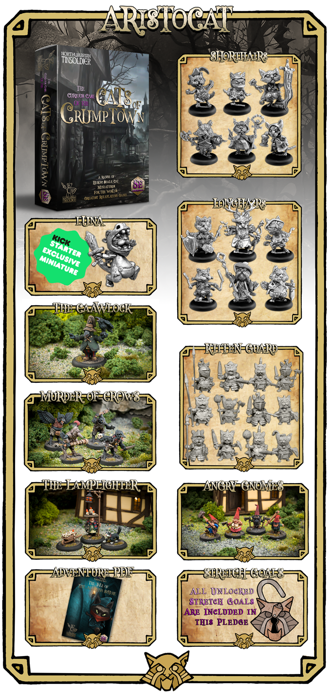 - AristoCat – A full set of 12 Cats of Crumptown and Luna the Dragon Kickstarter Exclusive Miniature in deluxe box set, The KittenGuard Add-on, The Lampligter Add-on, The Crows Add-on, The Gnomes Add-on and the Cawwlock Miniature. A whopping 37 Miniatures