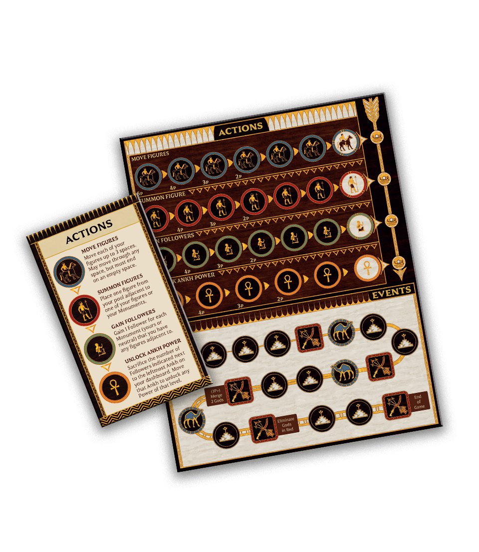 After the fourth Conflict, as the game nears its end, any gods whose Devotion is too low is removed from the game. They have simply been forgotten. If that leaves only one god left, they are the winner. If there are no gods left, then everyone loses as Egypt becomes an entirely secular society. If multiple gods are still left, play continues until the last event, when the god with the most Devotion wins. A god can also be victorious if at any point they reach the top of the Devotion track.