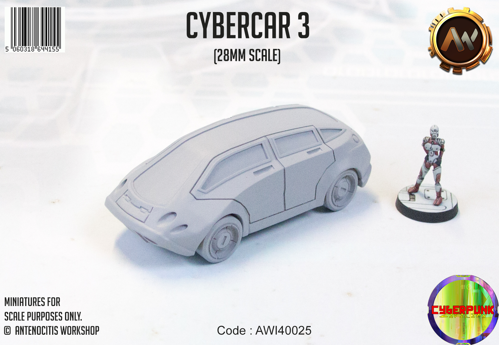 A cyberpunk-themed small van for 28mm scale cyberpunk wargaming. Made of resin