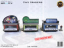 Each Tiny Trader stall has its own countertop with relevant items and high colour sign at the front. They also all have unique hinged reverse-etched doors and unique rear window designs. The roof is easily removable and slides off from the back, but protrudes enough at the front to create an awning that a 25mm based model can stand on. There’s a cigarette machine one of the short walls.